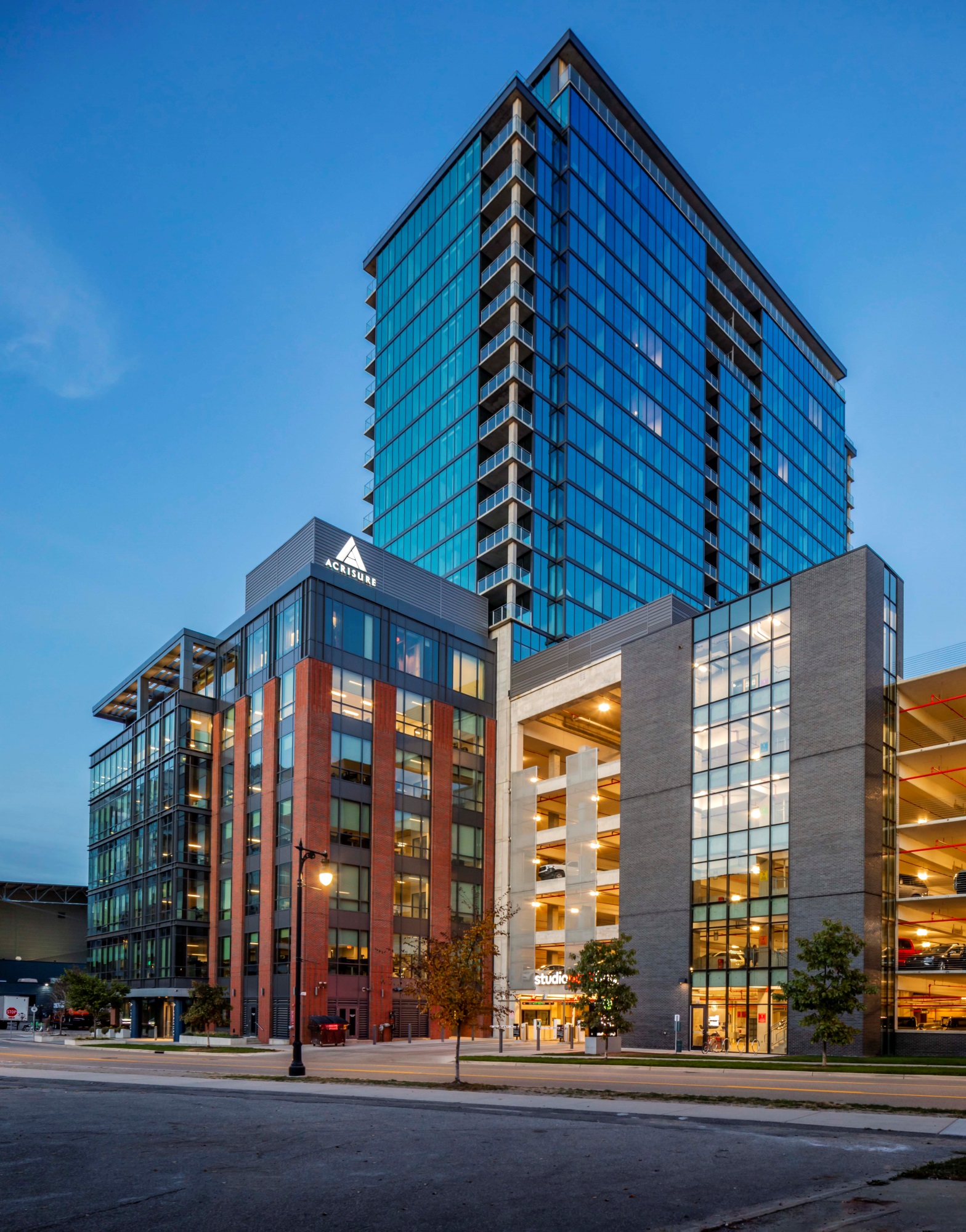 Acrisure, an insurance company experiencing exponential growth, had outgrown its current location. Attracting and retaining talent to the region was a key business strategy, and locating in a thriving urban environment where amenities like restaurants, retail, and entertainment options are all within walking distance was ideal. The firm found the optimal office location in the Studio Park development. From suburban to urban, Integrated Architecture was challenged with reimaging the master plan set on many acres to stacked program in an urban space. The re-designed headquarters resulted in a re-organized “vertical plan” spanning seven stories. Featuring a central first-floor work café that connects with the urban street vibe and neighborhood work cafes on each floor, that serve as a connectivity landmark within the flexible open office. Onsite parking is provided for employees in a multi-level structure that connects directly to the office floors.