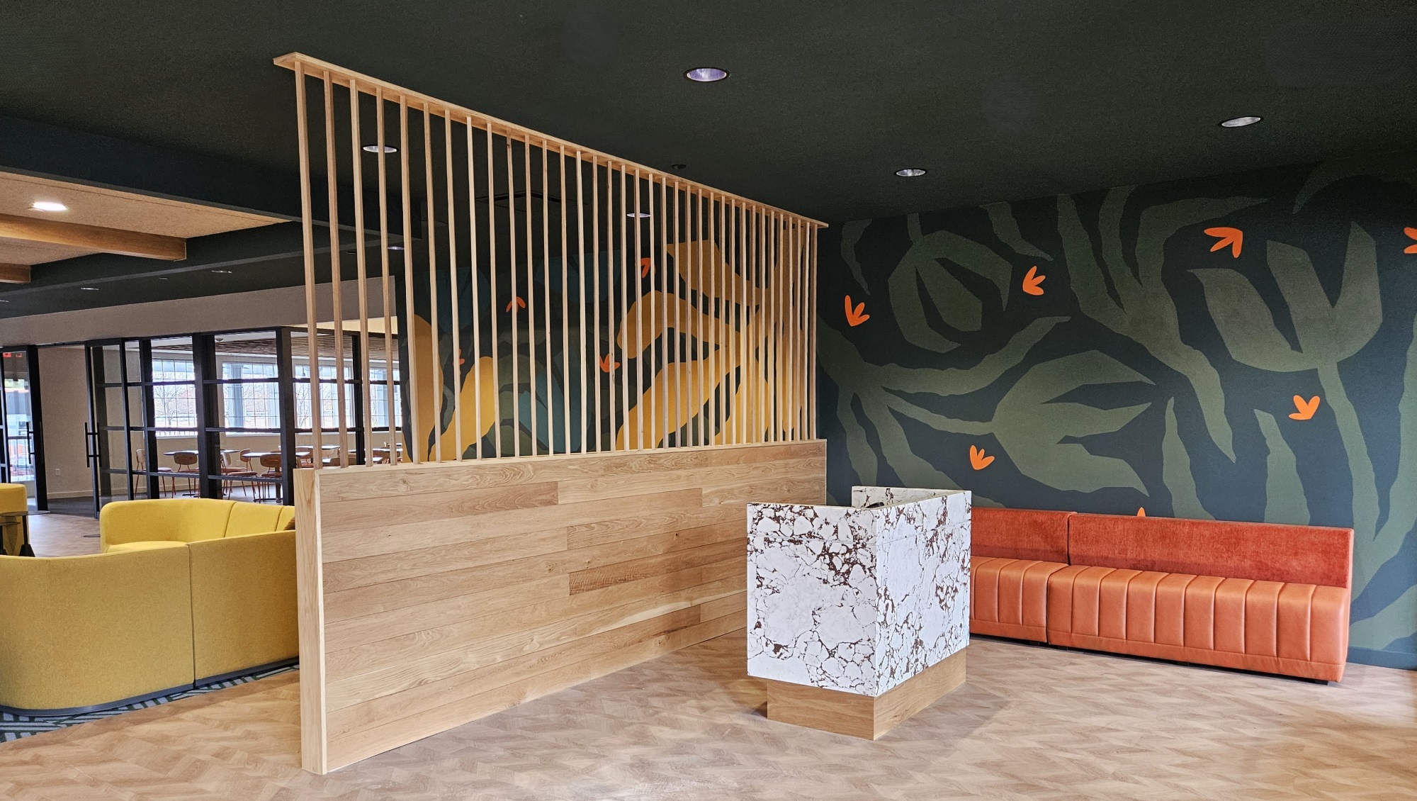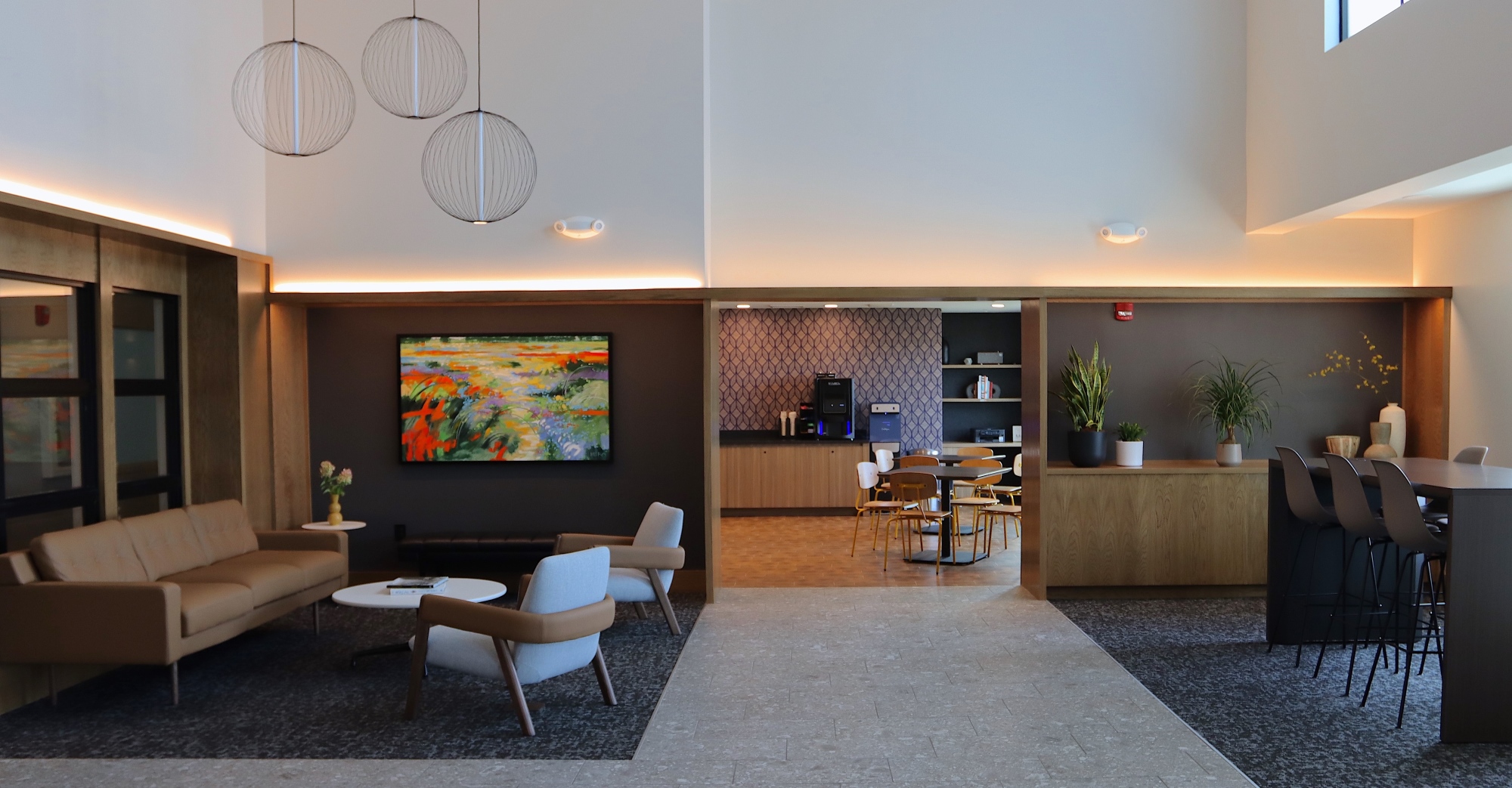 Drawing inspiration from its surroundings, the interiors of the Family Activity Center exude a light and casual vibe, aligning perfectly with the leisurely atmosphere of the pool and sports court settings. These new areas offer members a vibrant atmosphere to socialize and enjoy fellowship while providing enhanced convenience with new locker and bathroom facilities. Patio heaters are built into the outdoor dining areas to extend the al fresco season. By incorporating versatile design elements and amenities, such as adaptable indoor and outdoor spaces and climate control features, the CHCC’s Family Activity Center transforms a pool building into a vibrant, multi-seasonal hub that caters to the diverse preferences of its members year-round.
